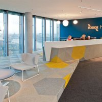 Innenarchitektonische Raumgliederung und Gestaltung des E-Commerce Unternehmens „hmmh multimediahaus AG“. Der Architekt Helmut Jahn vom Architekturbüro Murphy/Jahn aus Chicago entwarf den 82 Meter hohen und mit 22 Geschossen bestückten gläsernen Turm am Weser Ufer. Das Multimediaunternehmen hmmh hat hier mehrere Etagen des Towers angemietet. Etage 12 ist die Multifunktionsetage mit Empfangsbereich, offenen wie auch geschlossenen Meetingbereichen.
